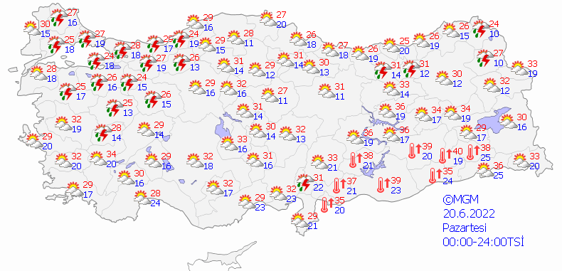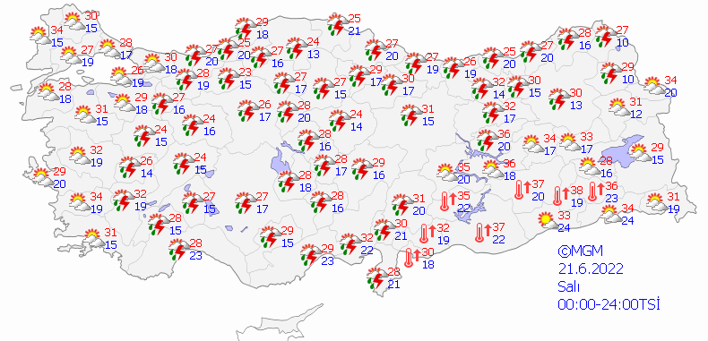 21 haziran salı günü ülke geneli birçok şehirde şiddetli yağmurlar bekleniyor. Karadeniz bölgesinin tamamı, İç anadolu bölgesinin tamamı ve Akdeniz bölgesinin tamamında, Doğu Anadolu bölgesinin ise kuzey kesimlerinde yağmur bekleniyor.