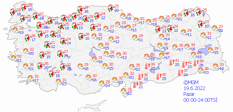 19 haziran hava durumunda ise yağışların batıya doğru ilerlediği görülüyor. Marmara bölgesi ile batı karadeniz bölgesi ile iç anadolu bölgesinde ve doğu anadolunun kuzey kesimleri ve doğu karadeniz kesimlerinde yağışlar bekleniyor.