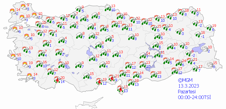13 Mart 2023 Pazartesi günü hava durumuna baktığımızda sadece Trakya ile Ege bölesinin kıyı kesimlerinde yağmur beklenmiyor. Adana, Mersin ve Antalya çevrelerinde ise yağmurun gökgürültüülü şekilde olacağı öğrenildi. İşte 13 Mart 2023 tarihli hava durumu.