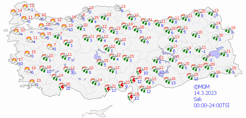 Marmara ile Ege bölgesi hariç 14 Mart 2023 Salı günü tüm illerde yağmur bekleniyor. İşte 14 Mart 2023 tarihli hava durumu.
