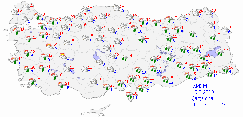 15 Mart 2023 tarihinde Türkiye genelinde sadece Doğu, Güneydoğu Anadolu, Ege ve Marmara'da, Karadeniz'in doğu kesimlerinde yağmur beklendiği görüldü. İşte 15 Mart 2023 tarihli hava durumu.