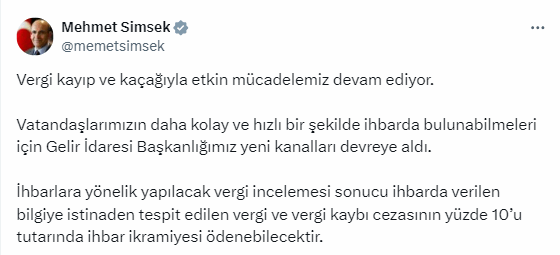 Bakan Şimşek, ihbarlara yönelik yapılacak vergi incelemeleri sonucunda, ihbarda verilen bilgilere istinaden tespit edilen vergi ve vergi kaybı cezasının yüzde 10'u oranında ihbar ikramiyesi ödeneceğini de ifade etti.