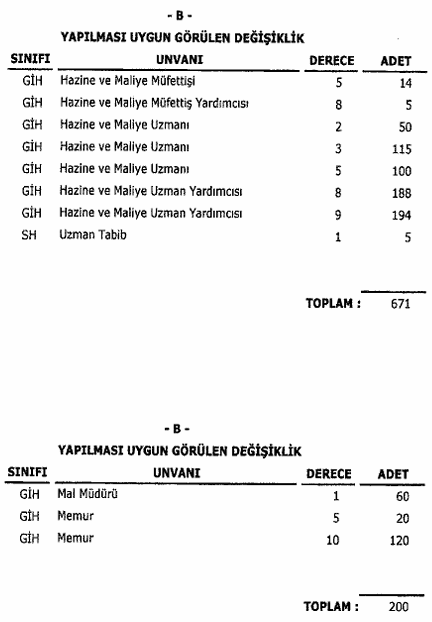 Resmi Gazete'de yayınlanan kararda Hazine ve Maliye Bakanlığı kadrolarına şu şekilde yer verildi:
