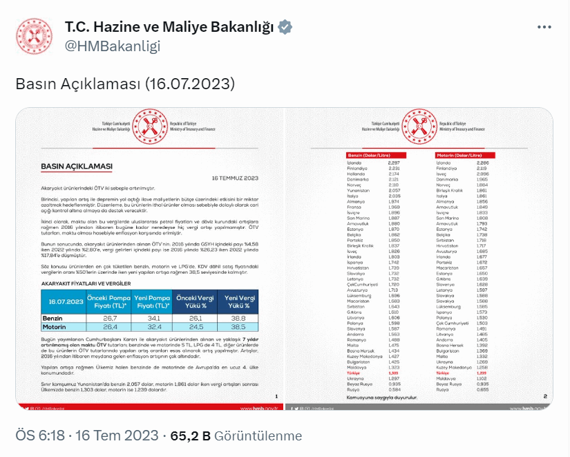 Sınır komşumuz Yunanistan'da benzin 2,057 dolar, motorin 1,861 dolar iken vergi artışları sonrası Ülkemizde benzin 1,303 dolar, motorin ise 1,239 dolardır."