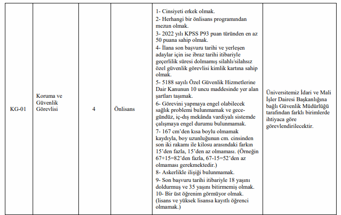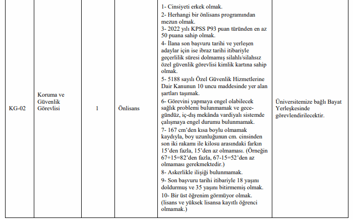 12- Koruma ve Güvenlik Görevlisi pozisyonuna başvurarak atanmaya hak kazanan adayların kamu veya özel sağlık kuruluşunda boy ve kilo ölçümü yaptırarak belgelendirmesi gerekmektedir.