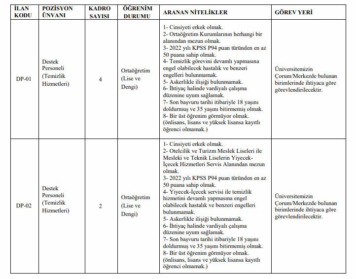 Hitit Üniversitesi en az lise mezunu güvenlik ve temizlik görevlisi alımı yapacak.