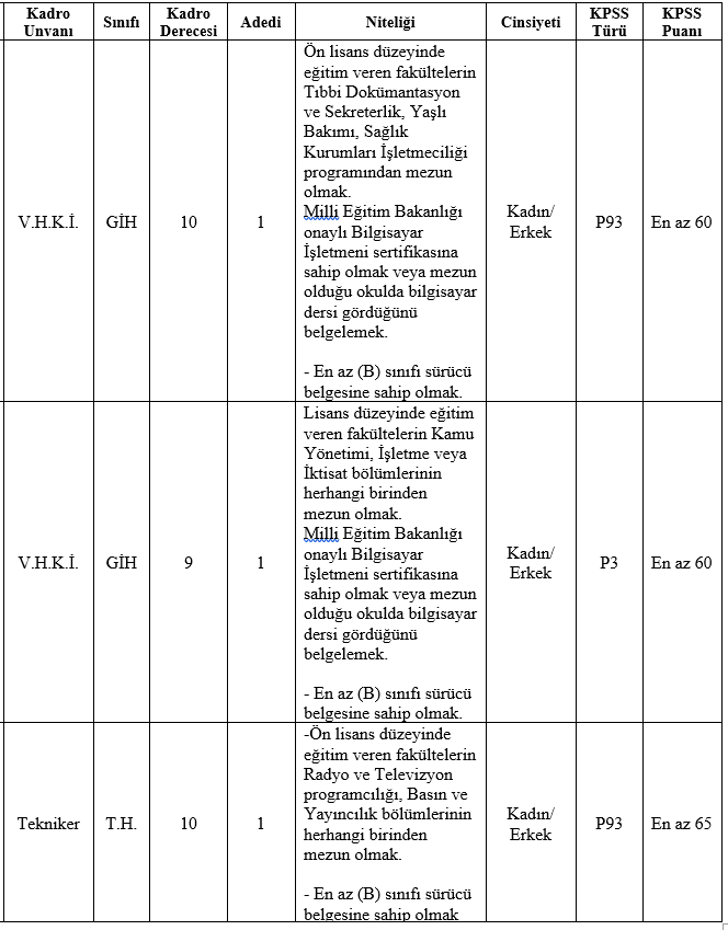 • İlan edilen unvanlar için mezun olunan okul itibari ile öğrenim şartını taşımak ve bu öğrenimle ilgili olarak 2022 yılı Kamu Personeli Seçme Sınavından (KPSS) alım yapılacak unvanların karşısında belirtilen puan türlerinden, belirtilen asgari KPSS puanını almış olmak.