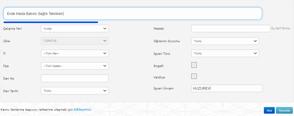 İlanlara başvuru yapacak adayların müracaatlarını İŞKUR üzerinden yapması gerekmektedir. İŞKUR'dan personel alımına başvuru yapmak için esube.iskur.gov.tr adresine gitmeniz gerekmektedir. Bu adrese gittikten sonra karşınıza çıkan ekranda iş arayan kısmından giriş yapmanız gerekmektedir. Giriş yaptıktan sonra İŞ İLANLARI kısmına tıklayarak iş arama sayfasına gidin. İş araya sayfasında ise aşağıda gösterildiği gibi ARADIĞINIZ POZİSYON yazan kısma başvuru yapmak istediğiniz kadroyu yazın ve ARA butonuna tıklayın.