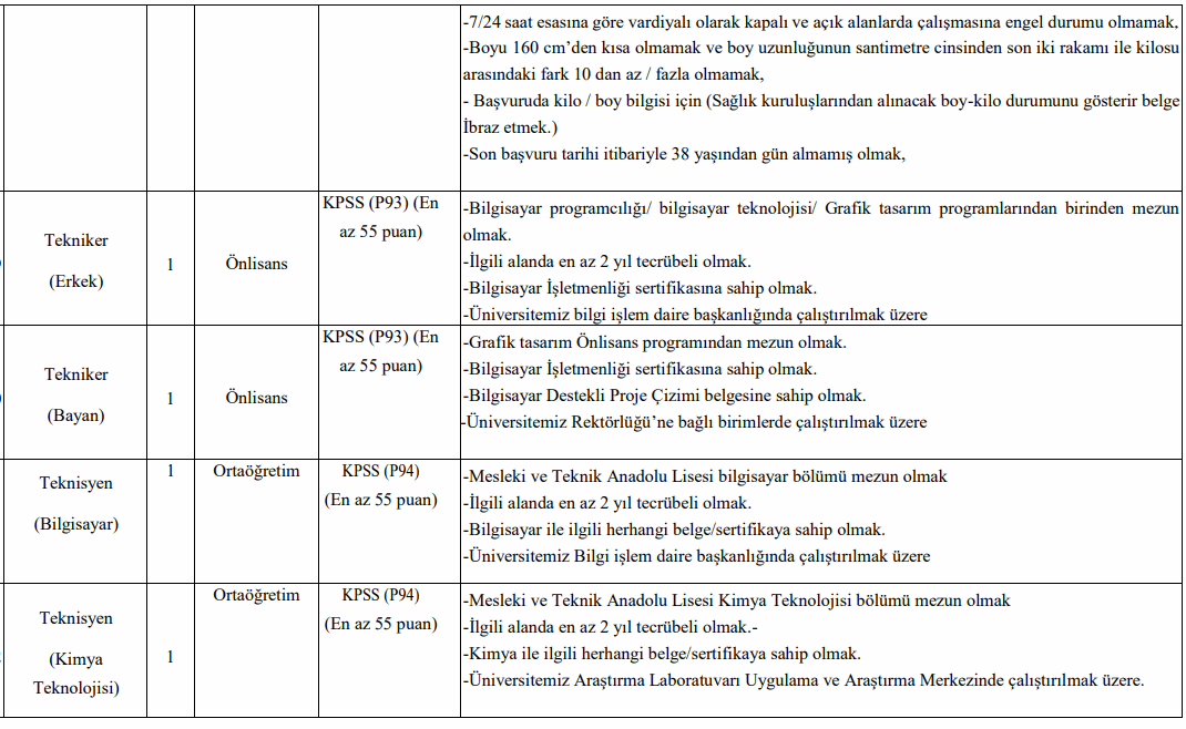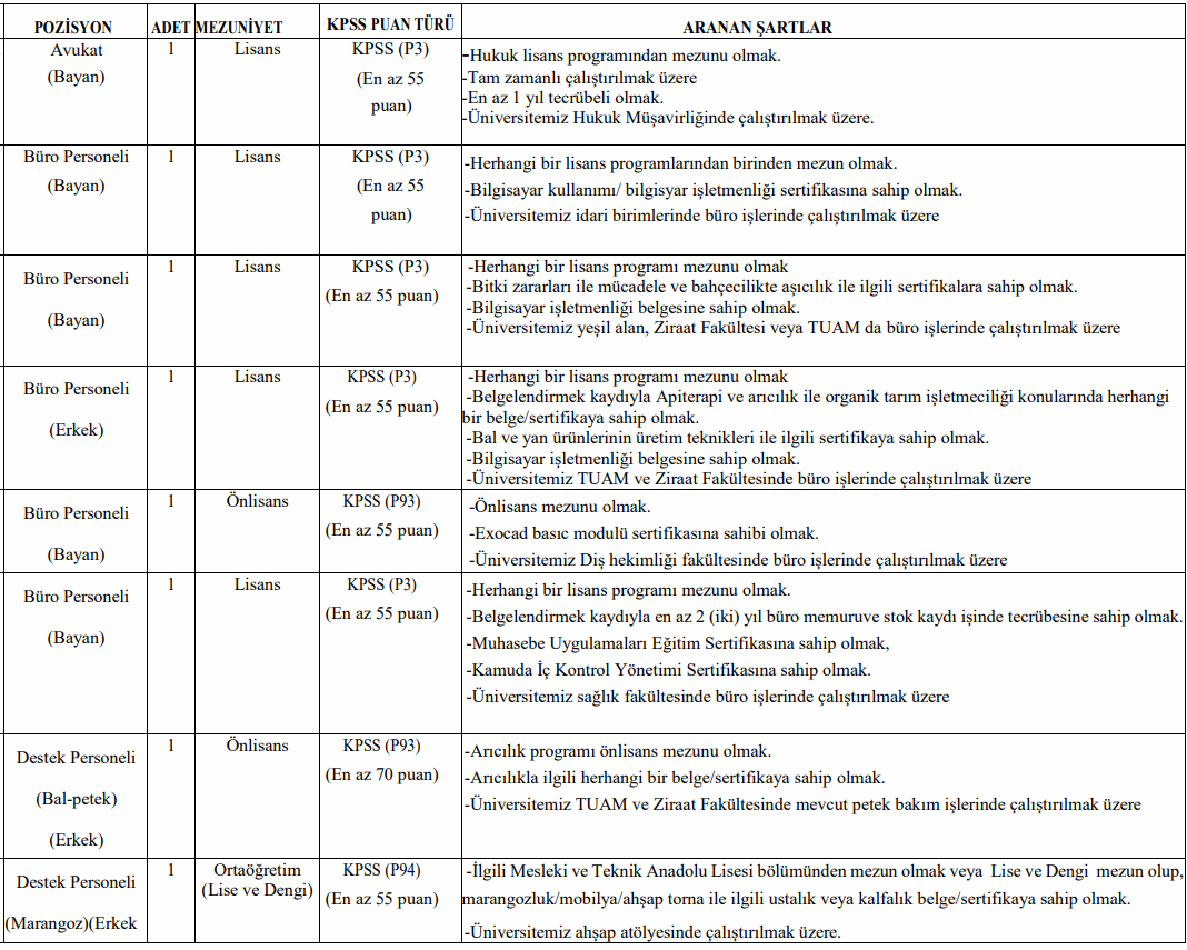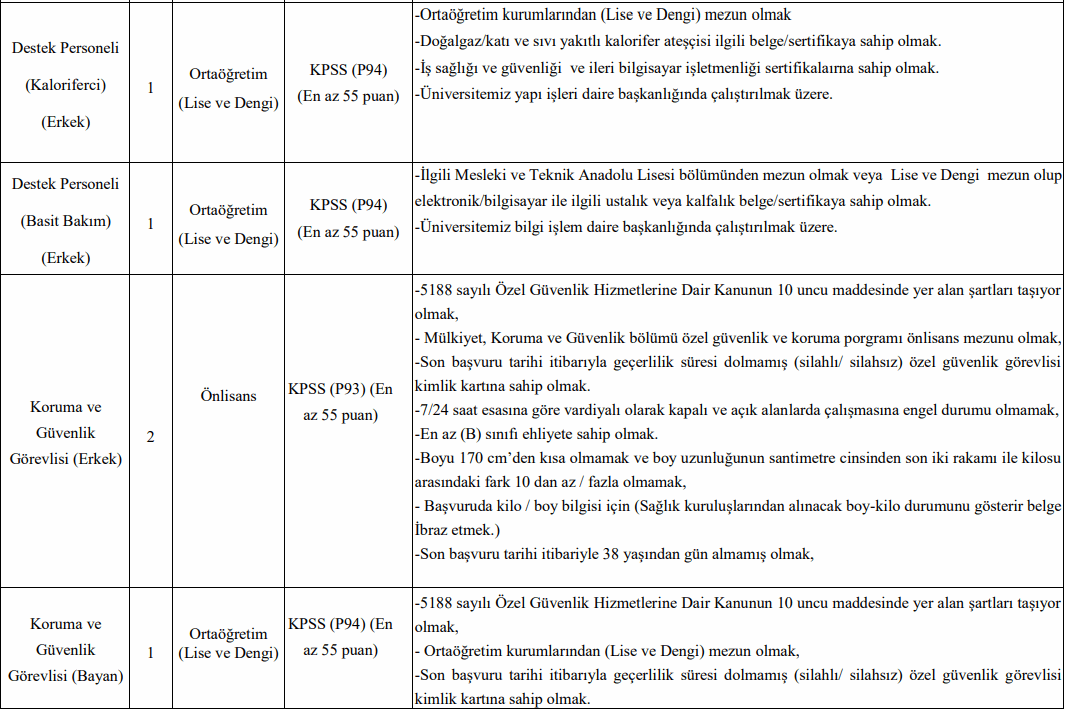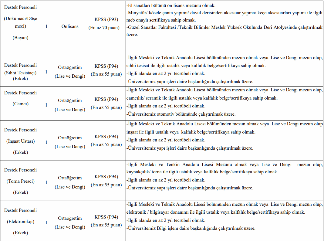 Iğdır Üniversitesi tarafından yayınlanan son dakika açıklamasında avukat, büro personeli, destek personeli, marangoz, dokumacı, sıhhi tesisatçı, camcı, inşaat ustası, elektronikçi, torna presci, kaloriferci, basit bakım personeli, güvenlik görevlisi, tekniker ve teknisyen alımı yapılacağına yer verildi. KPSS 55 ve 70 puan şartı ile yapılacak personel alımında başvurular başladı.