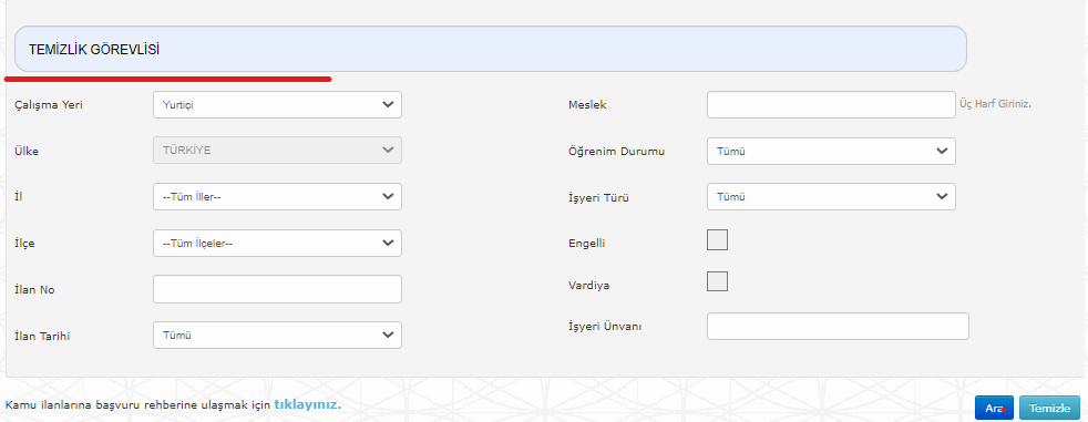 Yukarıdaki gibi aradığınız pozisyon yazan kısmına , başvuru yapmak istediğiniz kadroyu yazın ve ARA butonuna tıklayın. İlanlar aşağıda sıralanacaktır. Kadın erkek memurlar bu sayfada >>> TIKLA TAKİP ET