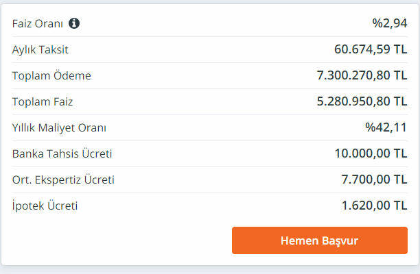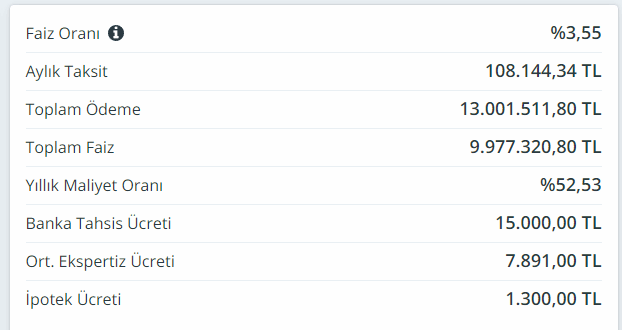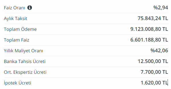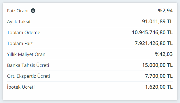 4 milyon liralık ev almak isteyen ve 1 milyon lira peşinatı olan bir kişi, bankaya gittiğinde 3 milyon lira kredi çekecekse bunun geri ödemesi ciddi seviyelere kadar çıkıyor. 2.94 faizle 120 ay vadeli çekilecek kredide aytlık geri ödeme 91 bin 11 lira olarak karşımıza çıkıyor.
