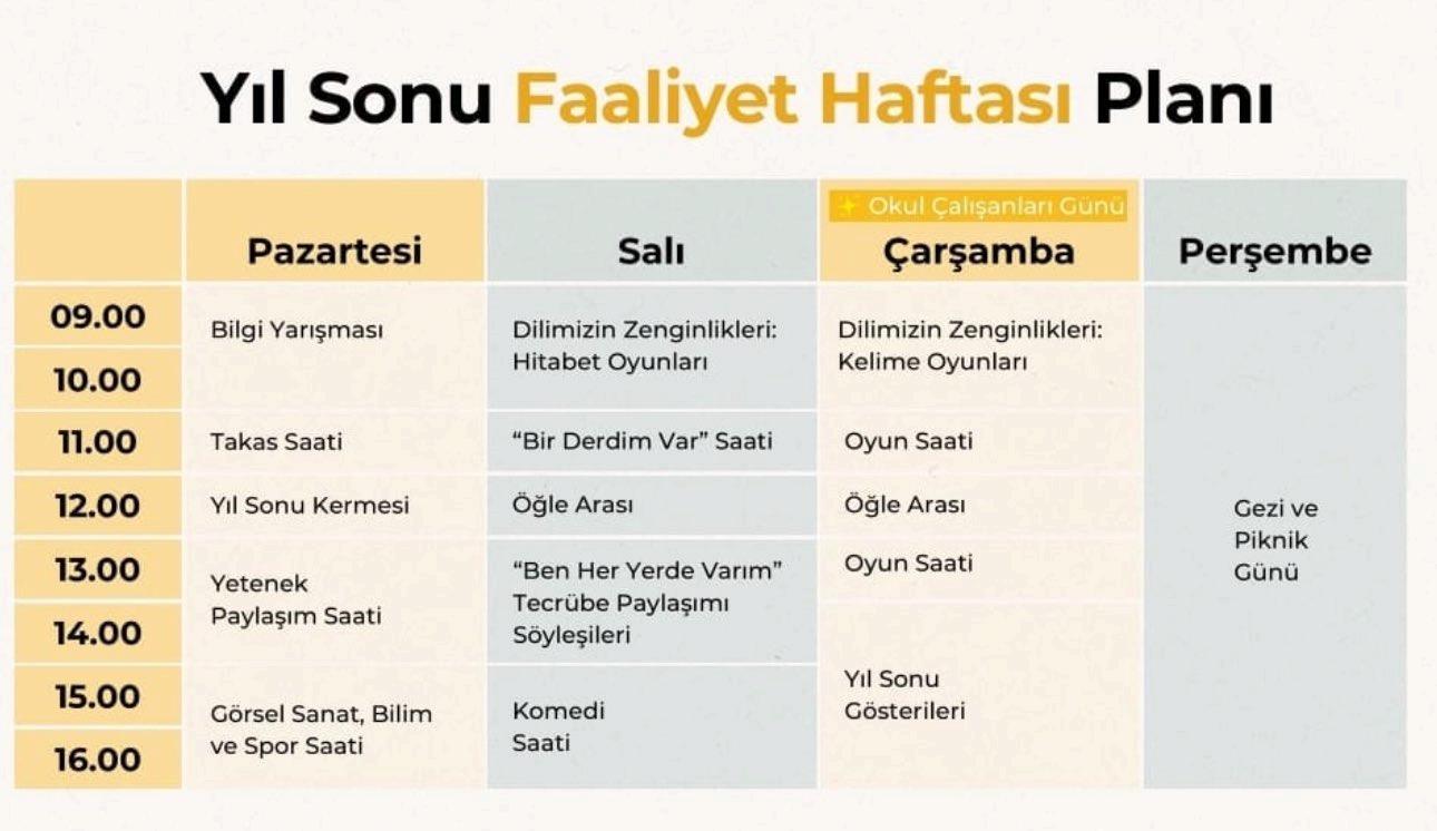 Bilindiği üzere son hafta ders olmuyor, bunun yerine Milli eğitim tarafından hazırlanan takvime göre öğrencilere bilgi yarışmaları, etkinlikler ve oyunlar oynatılıyor. 2023 2024 eğitim öğretim yılında ise bu takvim şu şekilde olacak: