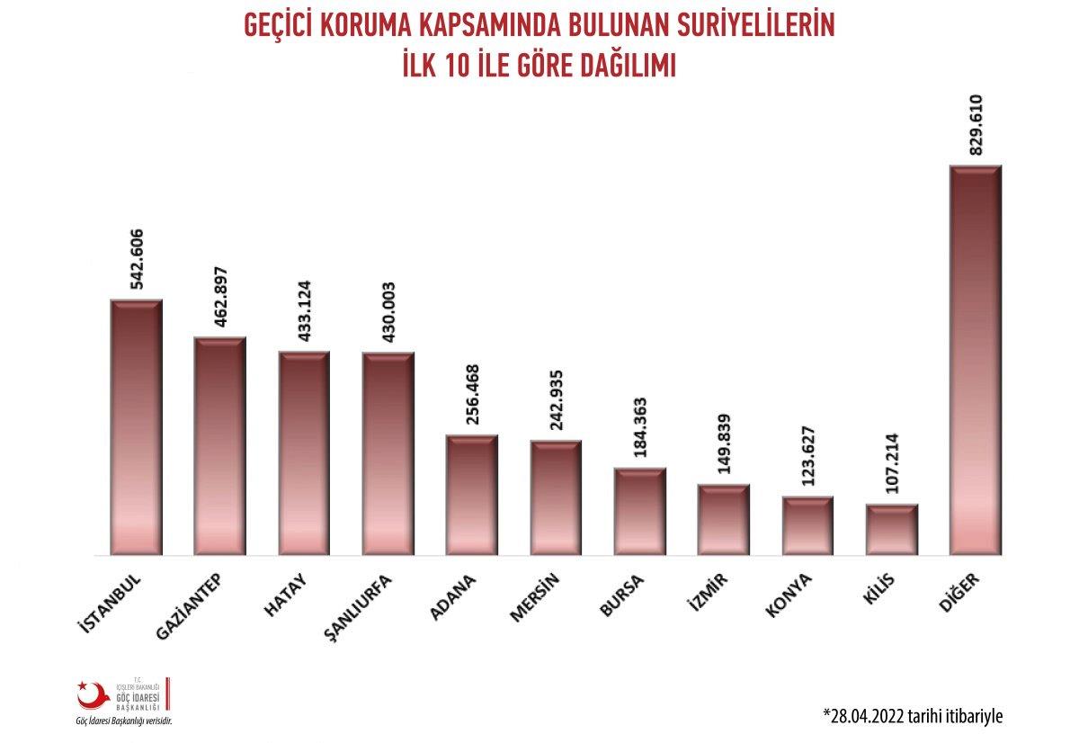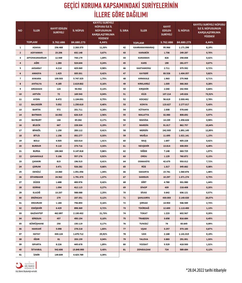 Suriyelilerin Türkiye'de illere göre dağılımları şu şekilde verildi: