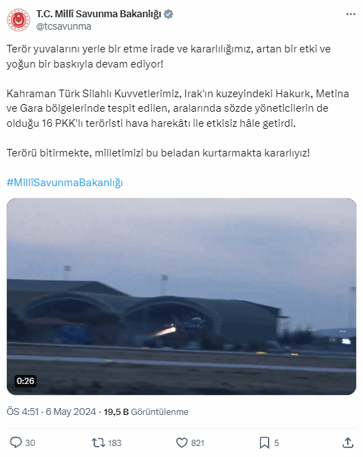 "Terör yuvalarını yerle bir etme irade ve kararlılığımız, artan bir etki ve yoğun bir baskıyla devam ediyor. Kahraman Türk Silahlı Kuvvetlerimiz, Irak'ın kuzeyindeki Hakurk, Metina ve Gara bölgelerinde tespit edilen, aralarında sözde yöneticilerin de olduğu 16 PKK'lı teröristi hava harekatı ile etkisiz hale getirdi. Terörü bitirmekte, milletimizi bu beladan kurtarmakta kararlıyız!"