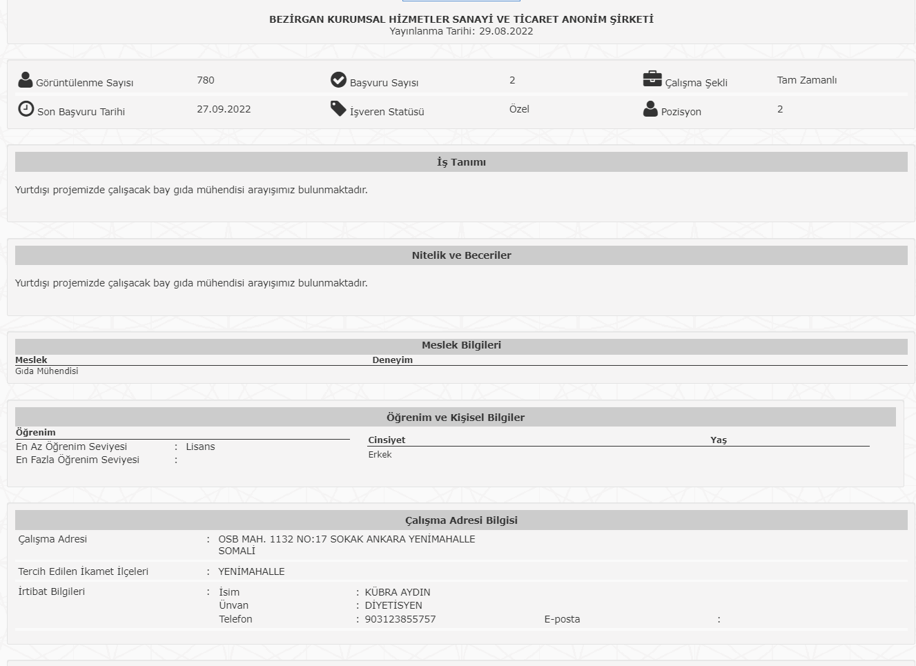 Duyuruya baktığımızda 2 erkek personel alınacağı görüldü. Yapılacak iş ise "Yurtdışı projemizde çalışacak bay gıda mühendisi arayışımız bulunmaktadır" şeklinde açıklandı.