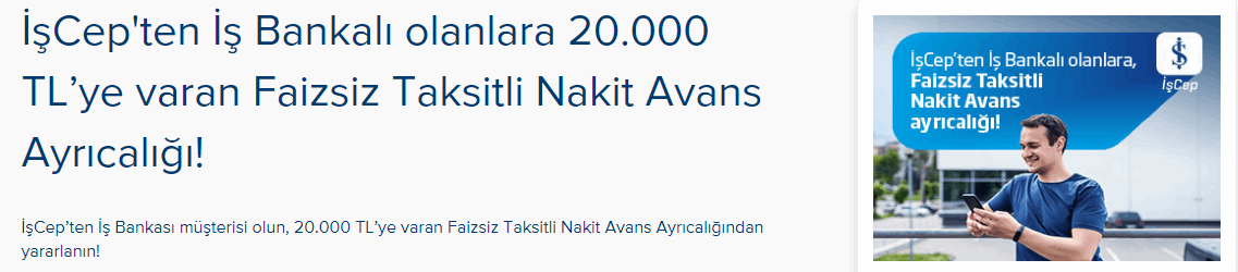 1 Ocak'ta başlayan ve 31 Ocak'a kadar sürecek olan kampanya kapsamında, kredi kartı başvuruları naylanan İş Bankası müşterileri, İşCep uygulamasındaki 'Müşteri Olmak İstiyorum' uygulamasıyla 20.000 TL'ye kadar faizsiz para çekim fırsatından yararlanabilecek. Faizsiz taksitli nakit avans vadesi 2 ile 6 ay arasında olmakla birlikte kampanyadan faydalanmak için kullanılacak olan nakit avans tutarı ise 300 TL ile 20.000 TL arası değişebilmektedir.