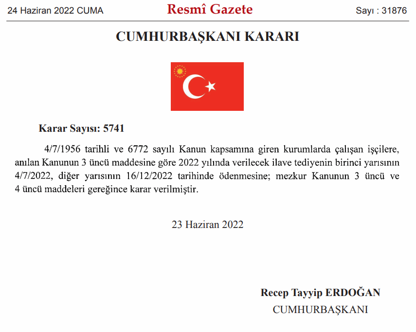 4/7/1956 tarihli ve 6772 sayılı kanun kapsamına giren kurumlarda çalışan işçilere anılan kanunun 3 üncü maddesine göre 2022 yılında verilecek ilave tediyenin birinci yarısının 4/7/2022, diğer yarısının 16/12/2022 tarihinde ödenmesine; mezkur kanunun 3'üncü ve 4 üncü maddeleri gereğince karar verilmiştir.
