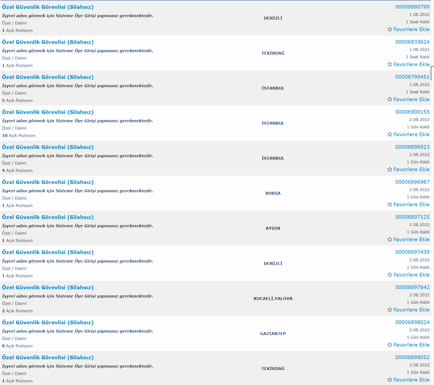 İŞKUR Bay Bayan Silahlı Silahsız 1.200 Güvenlik Görevlisi Alımı ilanlarının bir kısmı yukarıda ki gibidir. İŞKUR üzerinde yayında olan ilanlarında tamamına ulaşmak için https://esube.iskur.gov.tr/Istihdam/AcikIsMeslek.aspx adresini ziyaret edebilirsiniz.