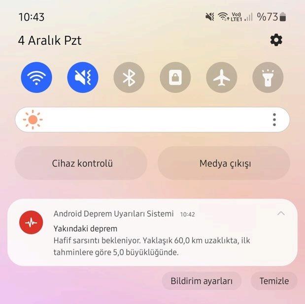 Android Deprem Uyarıları Sistemi adlı mobil uygulamada depremden hemen hemen 1 dakika önce bir uyarı bildirimi gönderildiği ve hafif sarsıntı beklendiği bildirildi. İşte söz konusu bildirim: