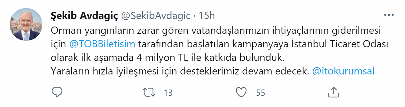 İstanbul Ticaret Odası (İTO) Başkanı Şekib Avdagiç, Türkiye Odalar ve Borsalar Birliği (TOBB) tarafından orman yangınlarında zarar gören vatandaşlar için düzenlenen kampanyaya İTO olarak 4 milyon TL katkıda bulunduklarını duyurdu.