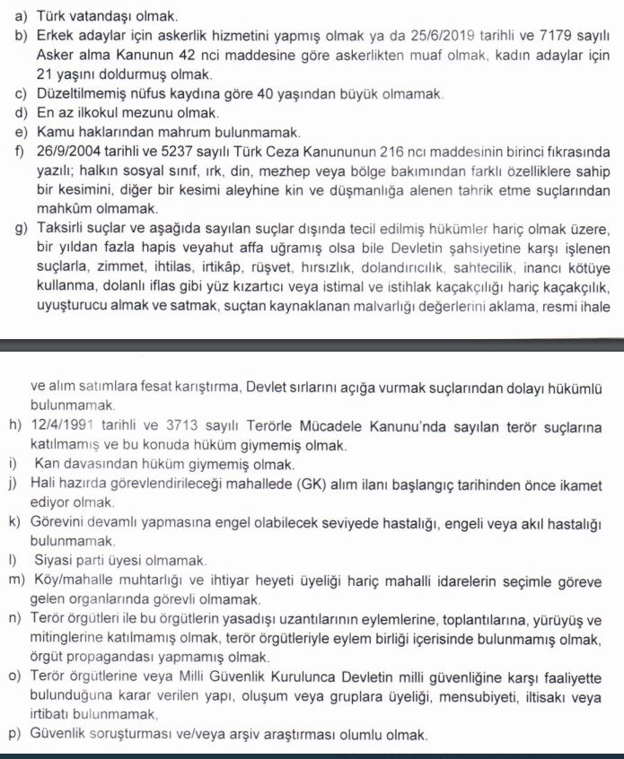 İlana başvuru yapacak adaylarda aranan şartlar şu şekilde:
