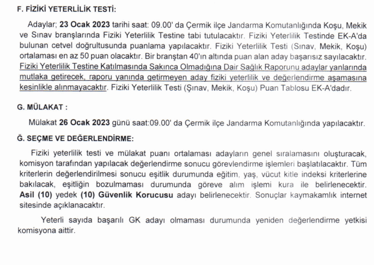 2-Güvenlik Korucusu olmaya istekli vatandaşlarımız 02 Ocak 2023–13 Ocak 2023 tarihleri arasında saat: 17:00'a kadar Çermik ilçe Kaymakamlığı Resmi Internet Sitesinden (www.cermik.gov.tr.) çermik Kaymakamlığı Yazı işleri Müdürlüğünden veya Çermik İlçe Jandarma Komutanlığından temin edecekleri Güvenlik Korucusu Alımı Başvuru Kılavuzunda belirtilen şartları taşımaları halinde müracaat edebileceklerdir.