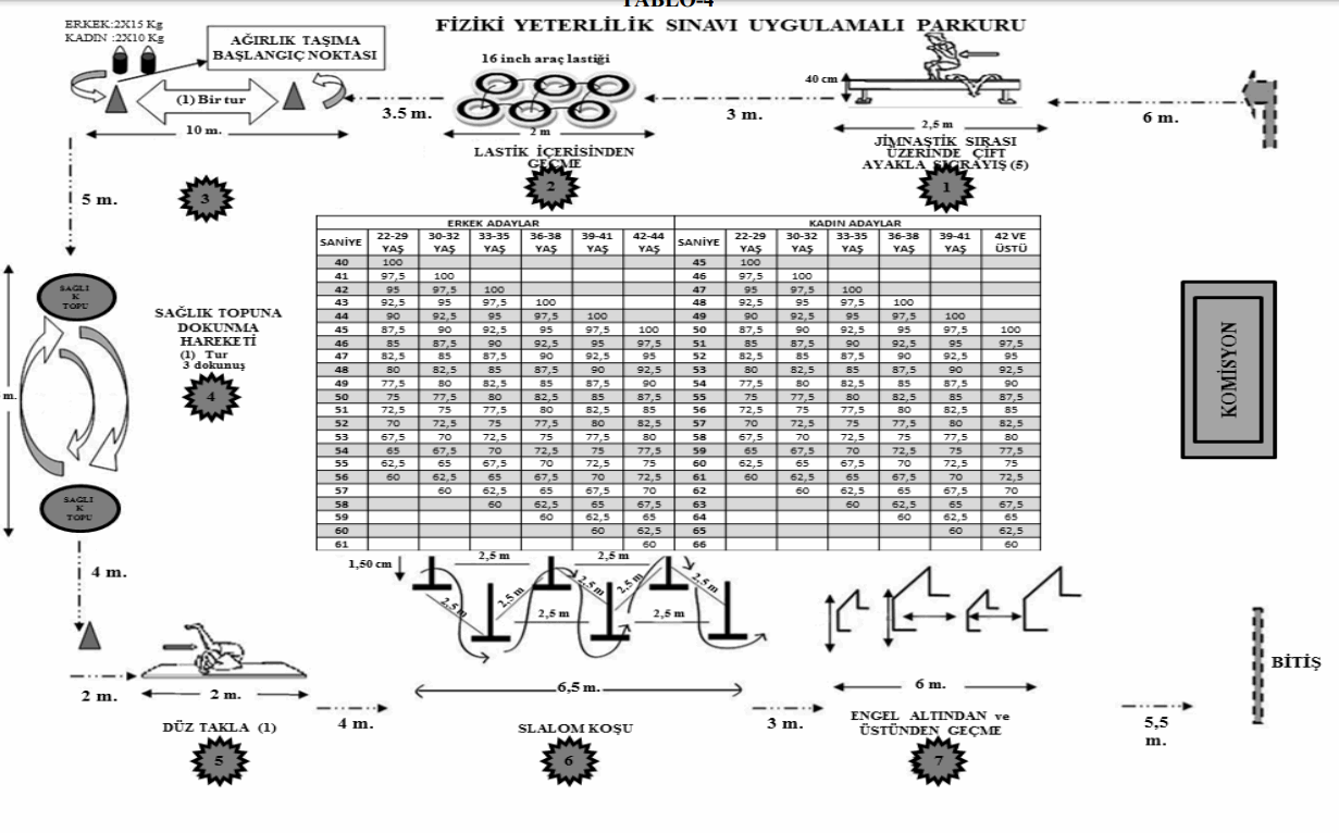 Tablo-4'te örneği bulunan parkurda, parkur geçiş talimatına göre uygulamalı olarak yapılır. (Parkur geçiş