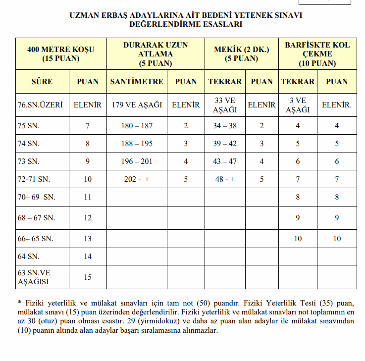 Koşu , durarak atlama, barfiks ve mekik aşamalarında adaylar , yukarıdaki tabloda belirtilen sınırları geçmek zorunda olacak. Burada yeterli puanı alamayanlar diğer seçim aşamasına geçemeyecek.