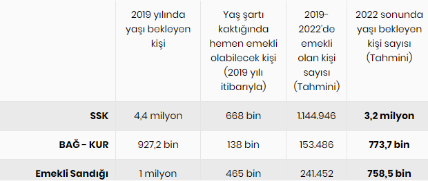 2019 yılında SGK tarafından hazırlanan rapora baktığımızda o tarihte toplamda 6.3 milyon EYT'li var. Bunların 1.3 milyonu yaş şartının kaldırılması durumunda heen emekli olabilecek. 2019 yılından 2022 yılına kadar emekli olacak kişi sayısı ise 1.5 milyon seviyesinde. Buna göre 2019 yılında 6.3 milyon olarak açıklanan EYT'li sayısı son 4 senede 1.5 milyon yeni emeklinin düşürülmesi ile 4.8 milyon olacak.