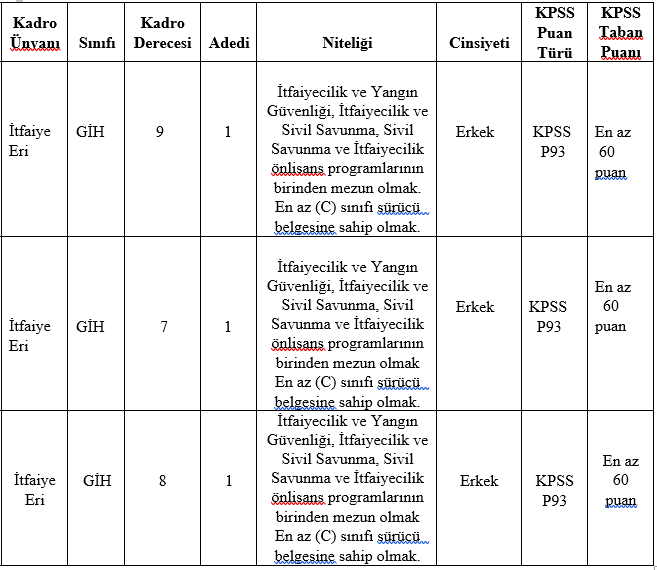 a) İlan edilen itfaiye eri kadroları için, mezun olunan okul itibariyle öğrenim şartlarını taşımak ve bu öğrenimle ilgili olarak 2022 yılı Kamu Personel Seçme Sınavından (KPSS) alım yapılacak kadroların karşısındaki puan türlerinden, belirtilen asgari KPSS puanını almış olmak,