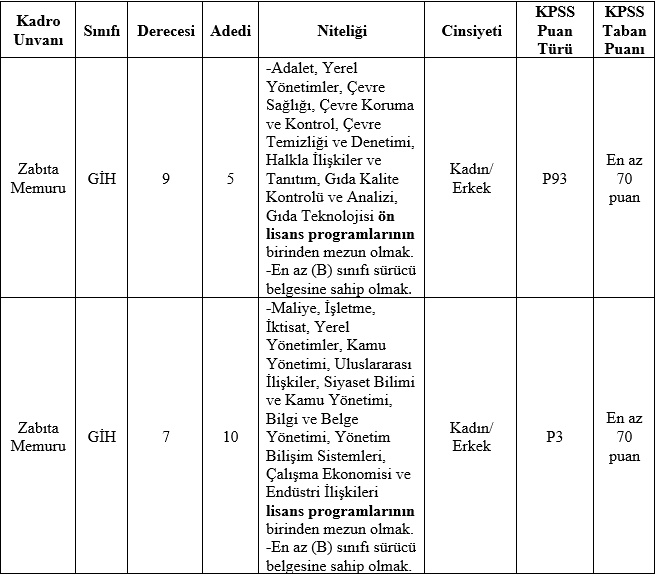 -657 sayılı Kanunun 48 inci maddesinin (A) fıkrasında belirtilen şartların yanı sıra Belediye Zabıta Yönetmeliğinin 13/A maddesinde yer alan özel şartlara göre, zabıta memuru kadrolarına başvuru yapılabilmesi için; tartılma ve ölçülme aç karnına, soyunuk ve çıplak ayakla olmak kaydıyla erkeklerde en az 1.67 metre, kadınlarda en az 1.60 metre boyunda olmak ve boyun 1 metreden fazla olan kısmı ile kilosu arasında (+,-) 10 kg.dan fazla fark olmamak. (Boy ve kilo tespitleri Kurumumuzca yapılacaktır.)