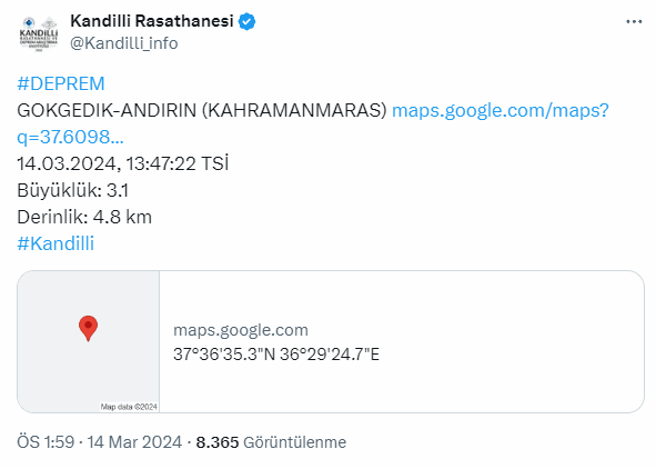 Kahramanmaraş'ın Andırın ilçesindeki Gökgedik Köyünde 3.1 büyüklüğünde deprem meydana geldi. Depremin derinliği 4.8 kilometre olarak kayıtlara geçti.