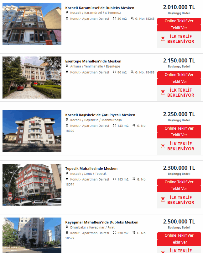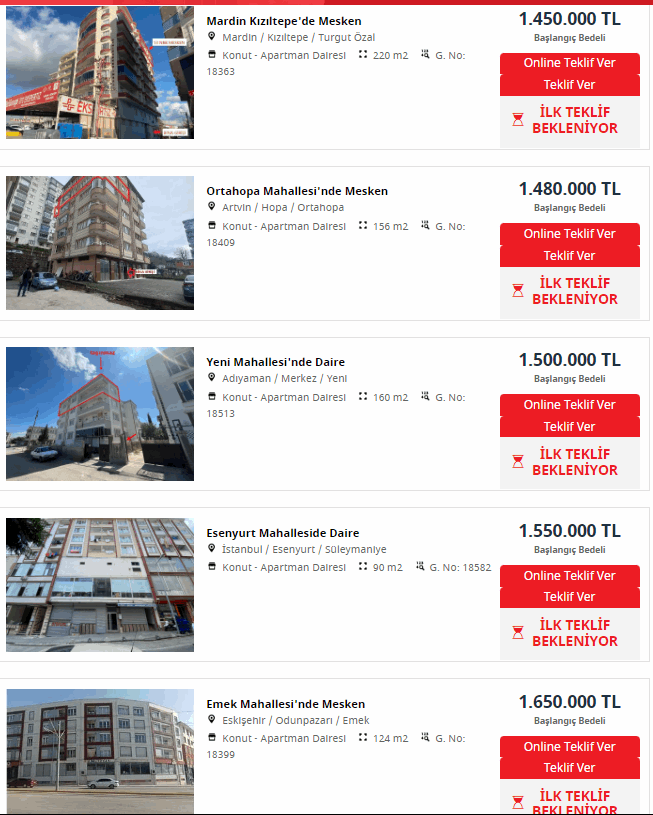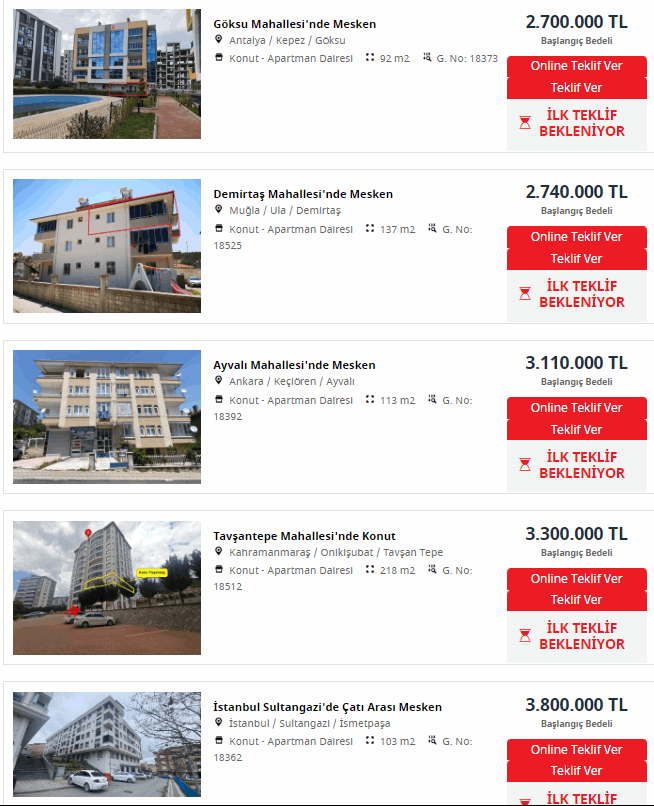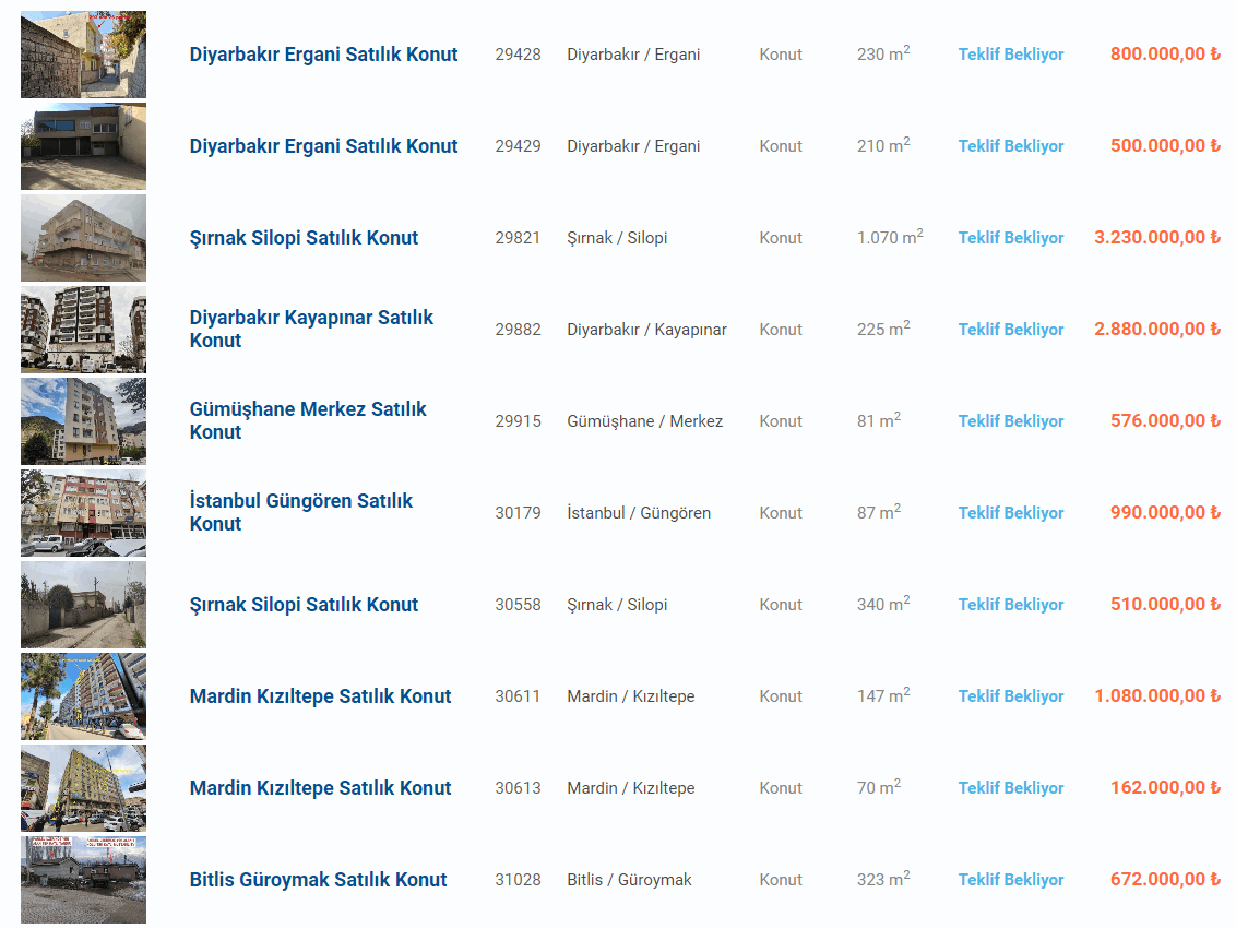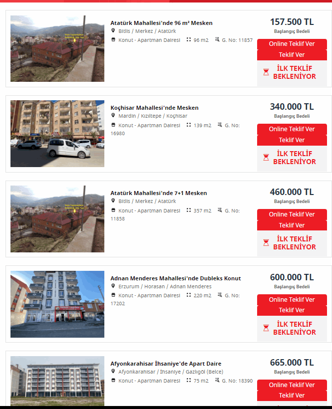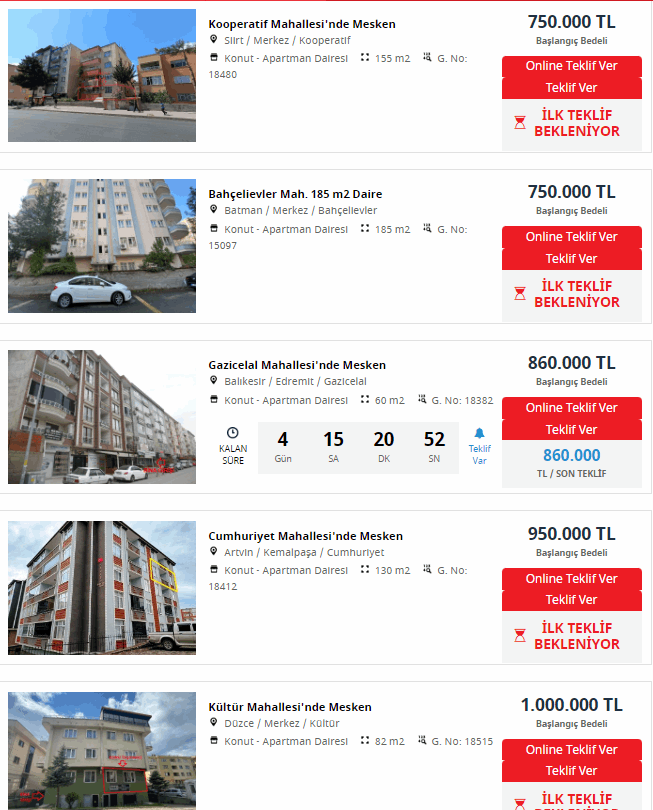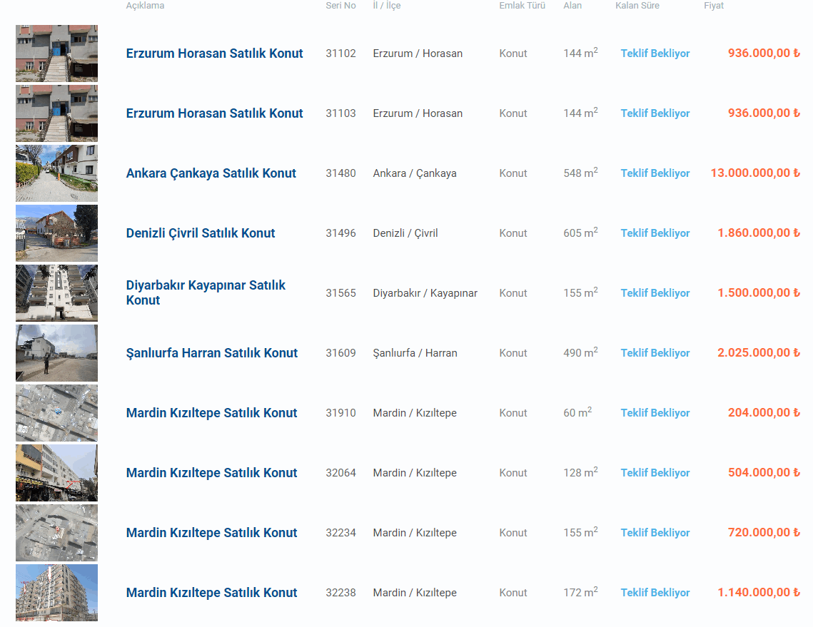 Ziraat Bankası tarafından da art arda duyurular yayınlandı. Yayınlanan evlere baktığımızda fiyatların 157 bin 500 liradan başladığı ve 3 milyon liraya kadar yükseldiği görülüyor. Konutların bulunduğu iller, konutların detayları ve fiyatları şu şekilde:
