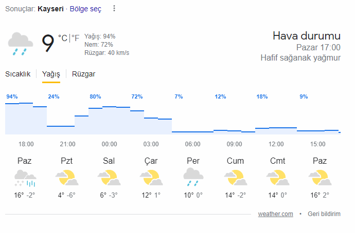 Meteoroloji resmi sayfasından Kayseri için yayınlanan hava durumu şu şekilde: