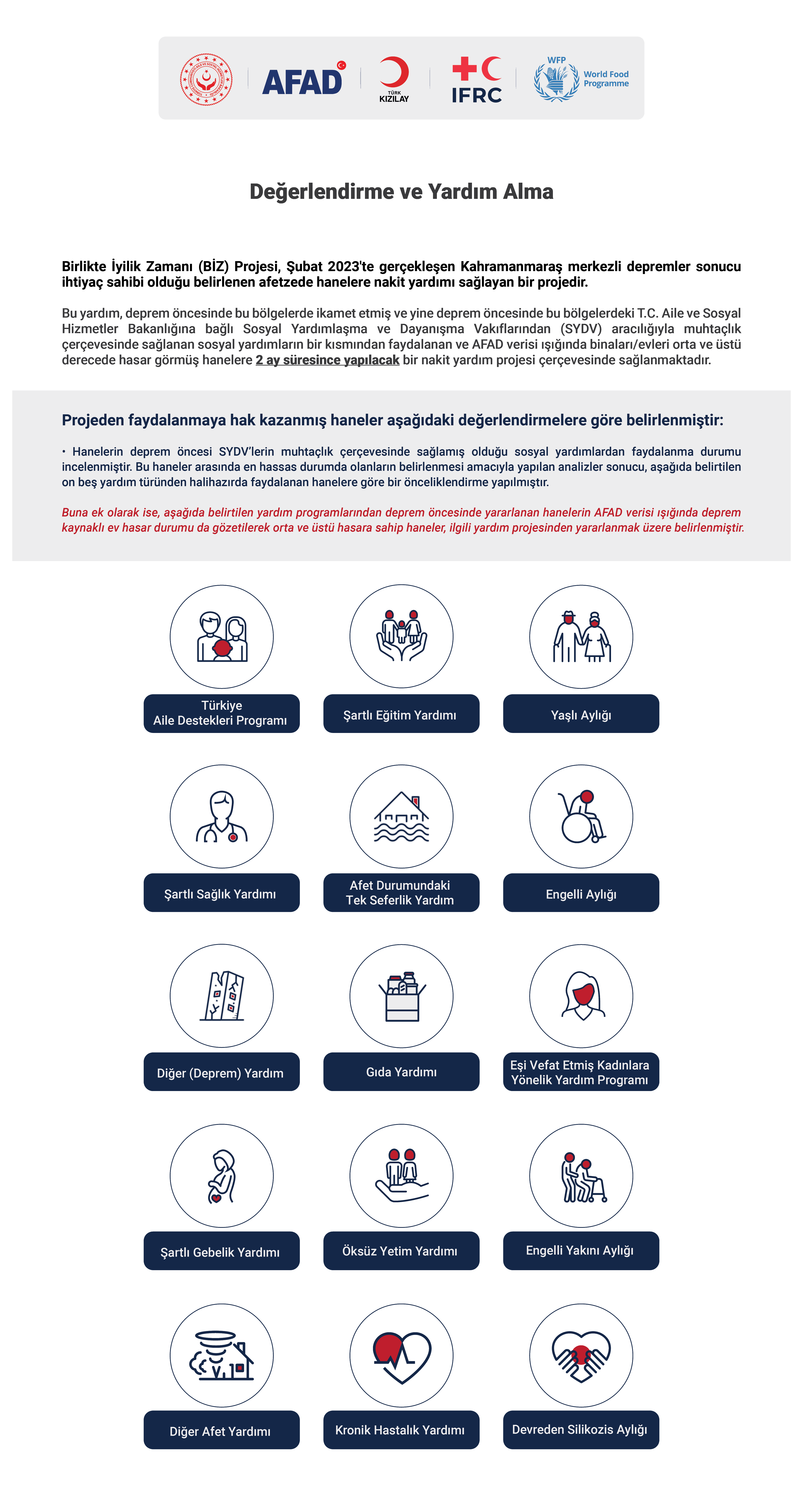 "Bu yardım deprem bölgesinde bu bölgelerde ikamet etmiş ve yine deprem öncesinde bu bölgelerdeki TC Aile ve Sosyal Hizmetler Bakanlığına bağlı Sosyal Yardımlaşma ve Dayanışma Vakıflarından (SYDV) aracılığıyla muhtaçlık çerçevesinde sağlanan sosyal yardımların bir kısmından faydalanan ve AFAD verisi ışığında binaları/evleri orta ve üstü derecede hasar görmüş hanmelere 2 ay süresince yapılacak bir nakit yardım projesi çerçevesinde sağlanmaktadir.