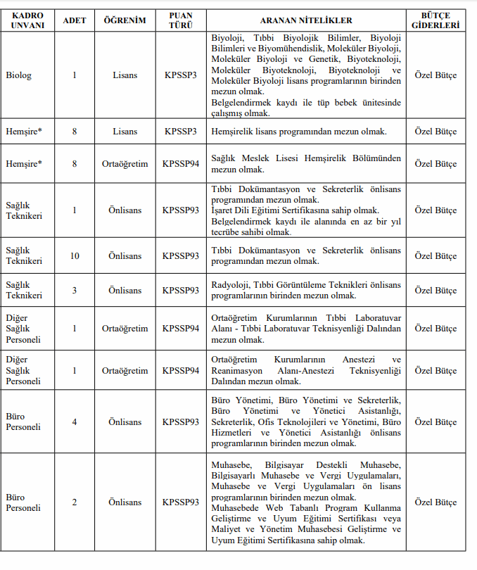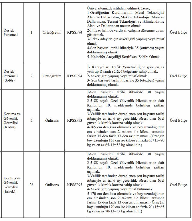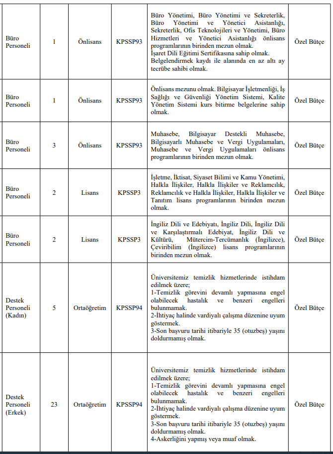 "Üniversitemiz birimlerinin personel ihtiyacının karşılanması amacıyla 657 sayılı Devlet Memurları Kanunun 4/B maddesine göre, 06/06/1978 tarihli ve 7/15754 sayılı Bakanlar Kurulu Kararı ile yürürlüğe giren 'Sözleşmeli Personel Çalıştırılmasına İlişkin Esaslara göre Üniversitemiz birimlerinde (tüm ilçeler dahil) görevlendirilmek üzere sözleşmeli personel istihdamı yapılacaktır. Biolog, Hemşire, Sağlık Teknikeri, Diğer Sağlık Personeli, Büro Personeli, Destek Personeli, Koruma ve Güvenlik Görevlisi unvanlı pozisyonlar için KPSS (B) gurubu puan sırasına konulmak kaydıyla alım yapılacaktır." ifadeleri ile yayımlanan İlanda , personel alımı yapılan kadrolara şu şekilde yer verildi: