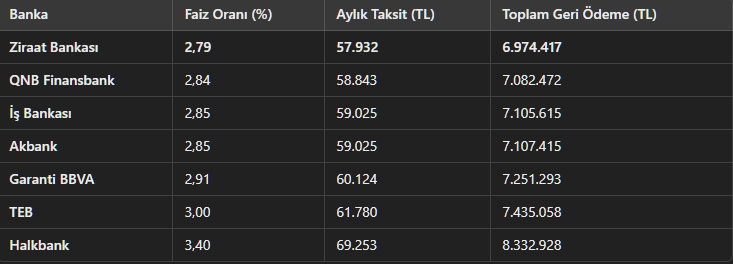 📌 Aylık en düşük taksit: 57.932 TL (Ziraat Bankası)