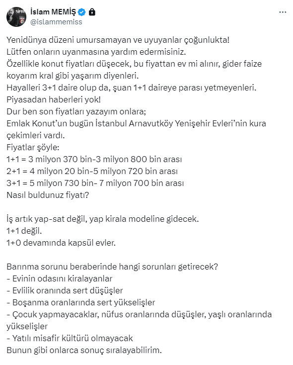 Bu konuya değinen İslam Memiş, parasına zamanında ev almak yerine mevduat faizine koyarak daha fazla para kazanacağını düşünenlerin şimdi 1+1 ev bile alamadığını söyledi. Ev alamamanın sonucunda vatandaşların sosyal yaşantıları da değişmeye başladı.