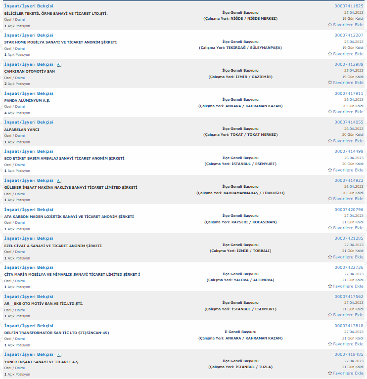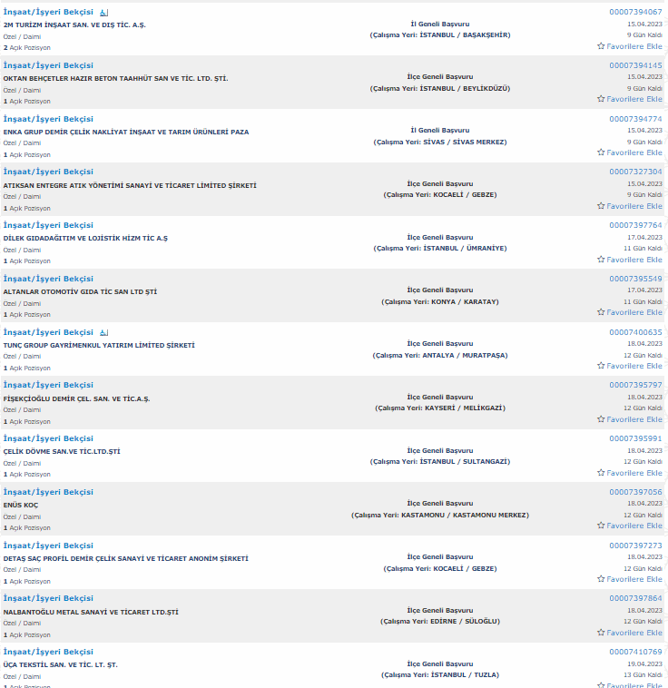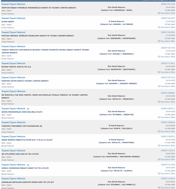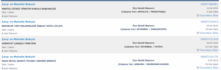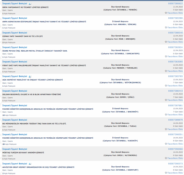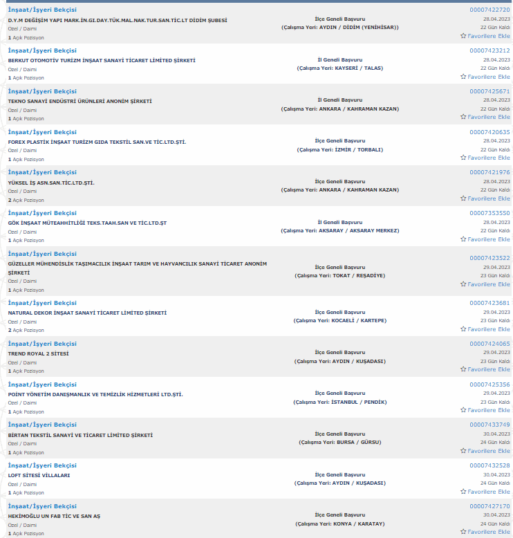 İŞKUR üzerinden yayımlanan ilanlara baltığımızda 22 ilde bekçi alımı yapılacağı görüldü. Alım yapılacak iller şu şekilde; Antalya, İstanbul, Ankara, Rize, Mersin,