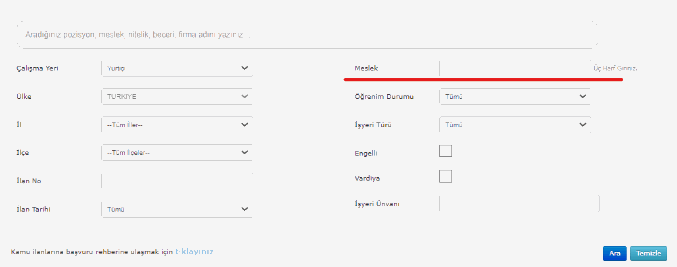 Burada meslek yazan kısımda kadronun adını yazarak başvurunuzu yapabilirsiniz. Not: Yukarıdaki ekranda il ilçe seçimi yapmanıza gerek yoktur. Kadronun adını yazıp ARA butonuna tıklamanız yeterlidir.