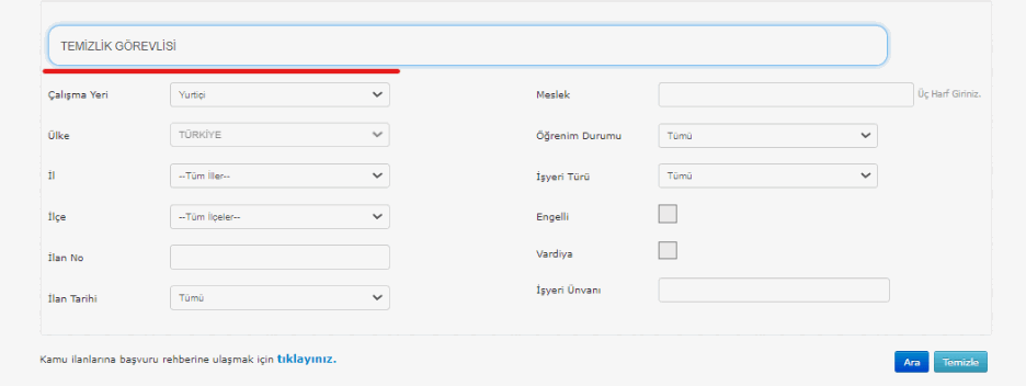 Yukarıdaki gibi aradığınız pozisyon yazan kısmına , başvuru yapmak istediğiniz kadroyu yazın ve ARA butonuna tıklayın. İlanlar aşağıda sıralanacaktır. Kadın erkek memurlar bu sayfada >>> TIKLA TAKİP ET
