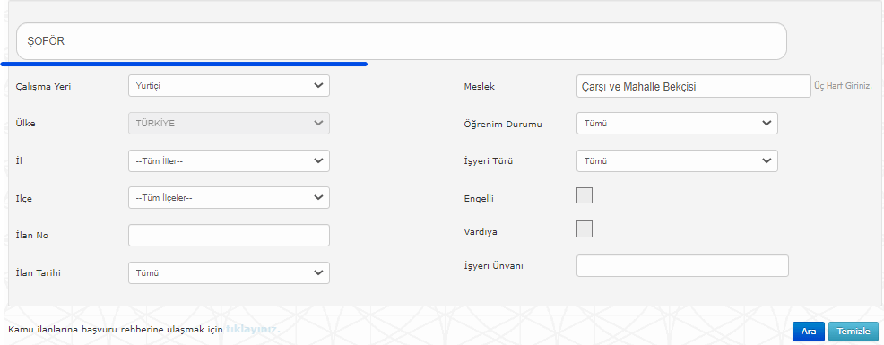 Yukarıdaki gibi aradığınız pozisyon yazan kısmına , başvuru yapmak istediğiniz kadroyu yazın ve ARA butonuna tıklayın. İlanlar aşağıda sıralanacaktır. Kadın erkek memurlar bu sayfada >>> TIKLA İNDİR