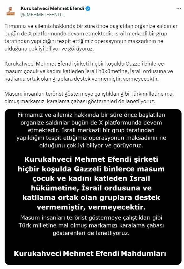 Markanın karalanmaya çalışıldığı belirtilen açıklamada, "Kurukahveci Mehmet Efendi şirketi hiçbir koşulda Gazzeli binlerce masum çocuk ve kadını katleden İsrail hükümetine, İsrail ordusuna ve katliama ortak olan gruplara destek vermemiştir, vermeyecektir. Masum insanları terörist göstermeye çalıştıkları gibi Türk milletine mal olmuş markamızı karalama çabası gösterenleri de lanetliyoruz" denildi.