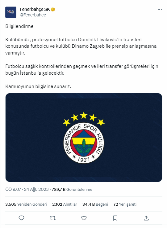 "Kulübümüz, profesyonel futbolcu Dominik Livakovic'in transferi konusunda futbolcu ve kulübü Dinamo Zagreb ile prensip anlaşmasına varmıştır.