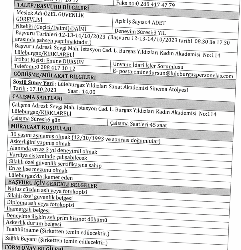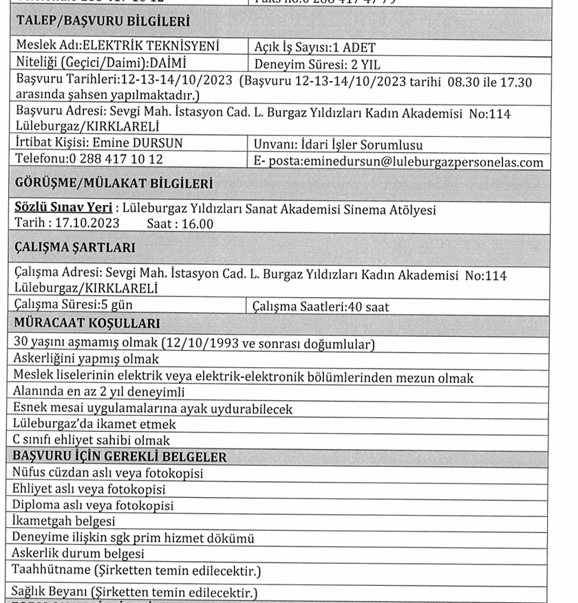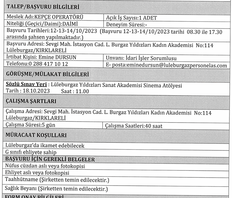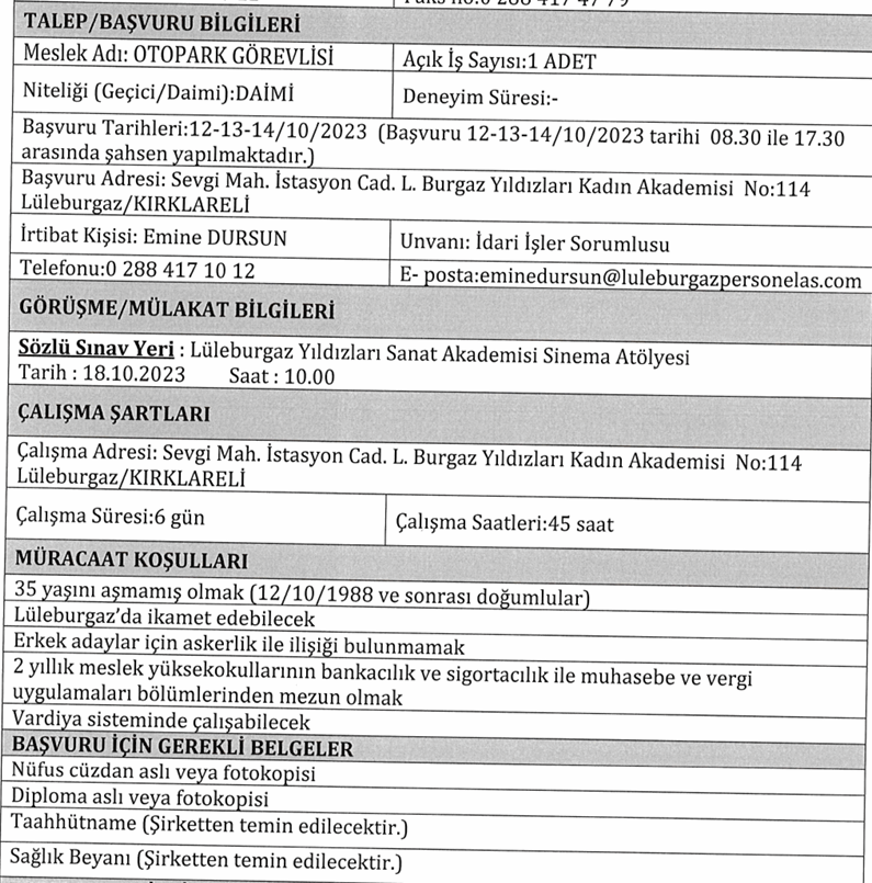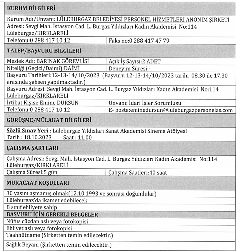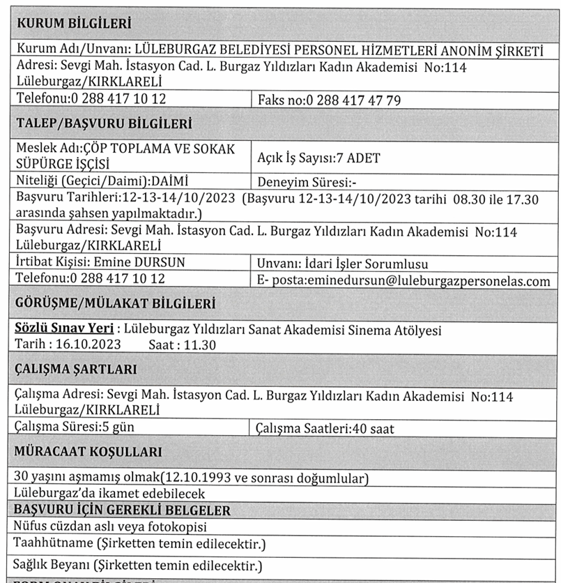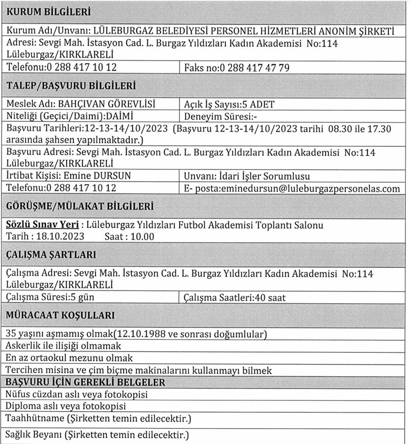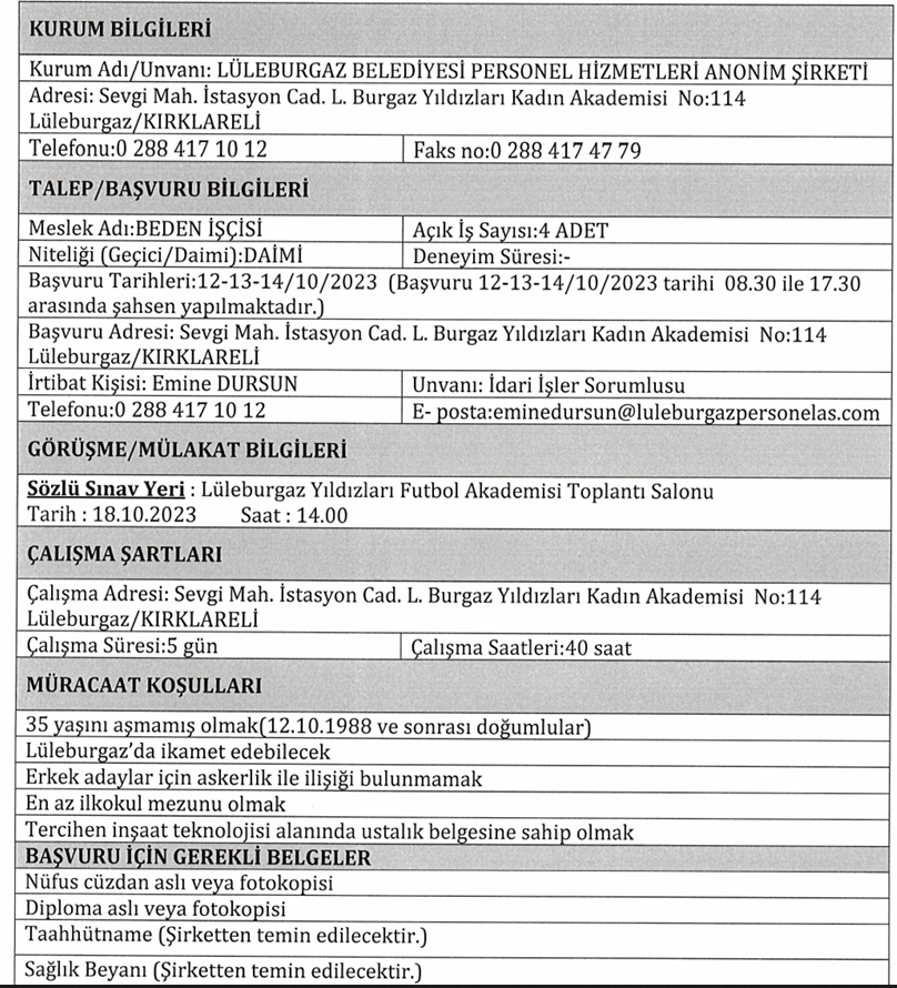 İŞKUR Kurum dışı kamu işçisi alımı ilanları kısmından yayınlanan son dakika açıklamasında üleburgaz Belediyesi bünyesinde istihdam etmek üzere personel ve işçi kadrolarına alım yapılacağı görüldü.