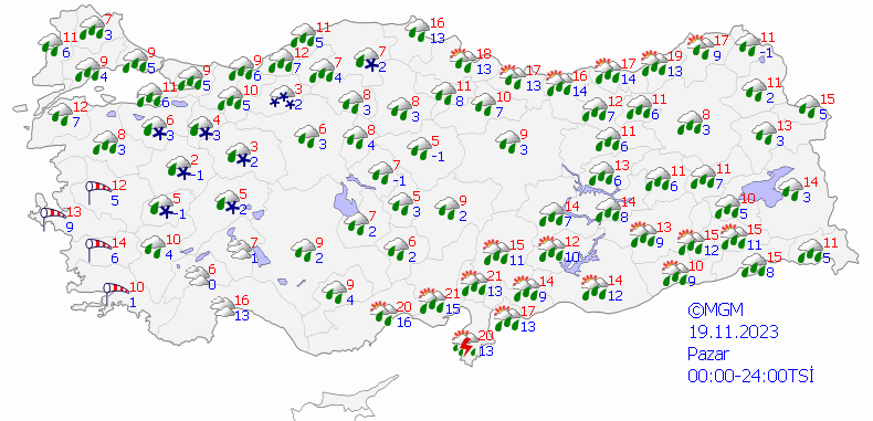 Akdeniz Bölgesi'nde beklenen sağanak ve yer yer gök gürültülü sağanak yağışların, yarın (Cumartesi) öğle saatlerinden itibaren Antalya, akşam saatlerinden itibaren Isparta, Burdur, Mersin, Adana, gece saatlerinden itibaren ise Hatay, Osmaniye, Kahramanmaraş çevrelerinde kuvvetli (21-50 kg/m2), Antalya'nın doğusunda çok kuvvetli (51-75 kg/m2) olacağı tahmin edilmektedir. Yağışların 2000 m üzeri rakımlı yerlerde yer yer karla karışık yağmur ve kar yağışı şeklinde olması beklenmektedir. Kuvvetli yağışın sebep olabileceği ulaşımda aksamalar, ani sel, su baskını, hortum riski, yıldırım ve yerel dolu yağışı gibi olumsuzluklara karşı dikkat edilmesi gerekmektedir.