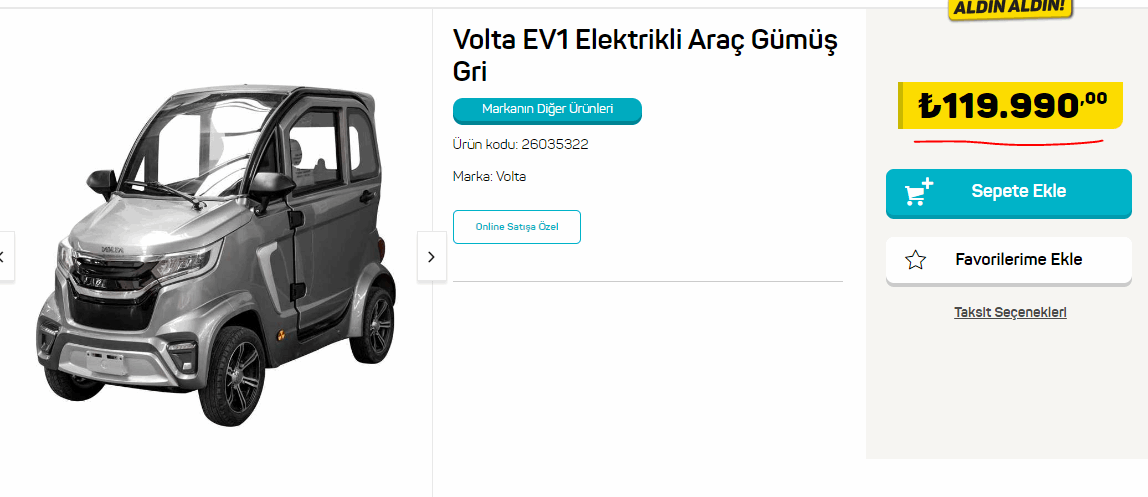 A101 marketler tarafından bir son dakika açıklaması yapıldı. A101 resmi sayfasından yapılan açıklamada 9 Mart tarihinden itibaren sadece internet adresi üzerinden elektrikli araba satışı yapılacağına yer verildi. Volta EV1 marka elektrikli arabaya baktığımızda A101 sayfasında bugünden itibaren satışının başladığı görülürken araç hakkında bilgilerin de verildiği görüldü.