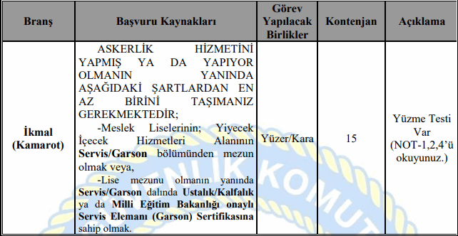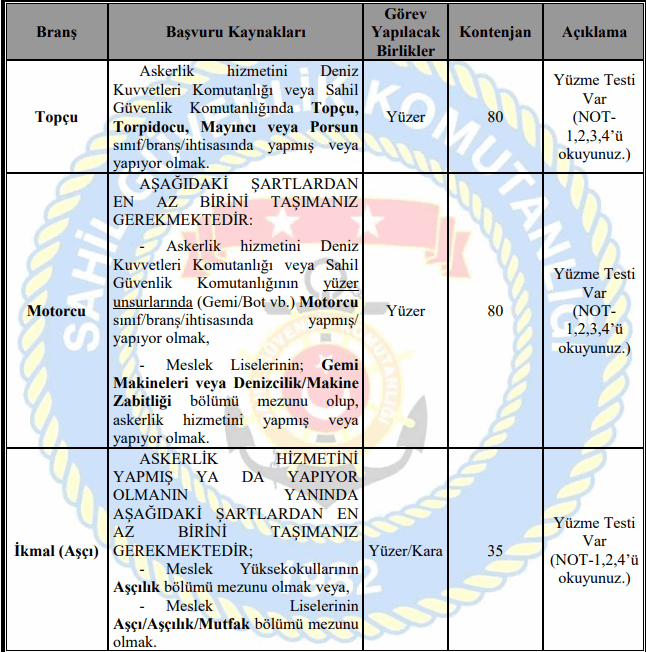 Sahil Güvenlik Komutanlığı 210 uzman erbaş alımı branş dağılımı şu şekilde;