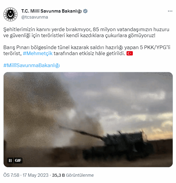 Milli Savunma Bakanlığı tarafından yapılan açıklamada, "Şehitlerimizin kanını yerde bırakmıyor, 85 milyon vatandaşımızın huzuru ve güvenliği için teröristleri kendi kazdıklara çukurlara gömüyoruz! Barış Pınarı bölgesinde tünel kazarak saldırı hazırlığı yapan 5 PKK/YPG'li terörist, #Mehmetçik tarafından etkisiz hale getirildi." denildi.