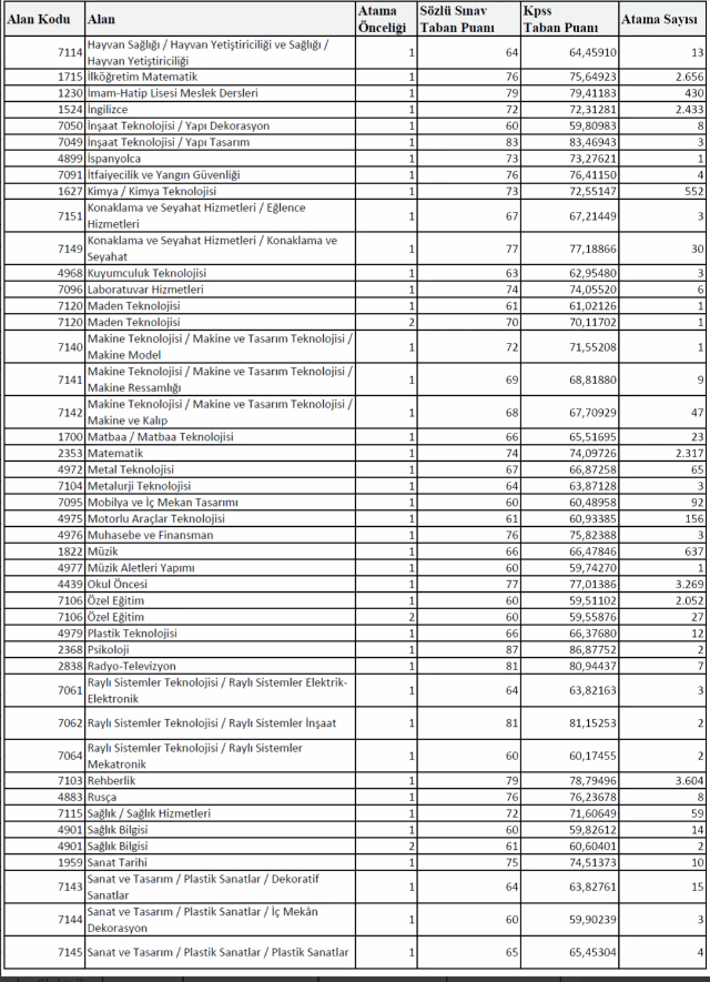Maden teknolojisi branşına ise 61 KPSS ile atama oldu.